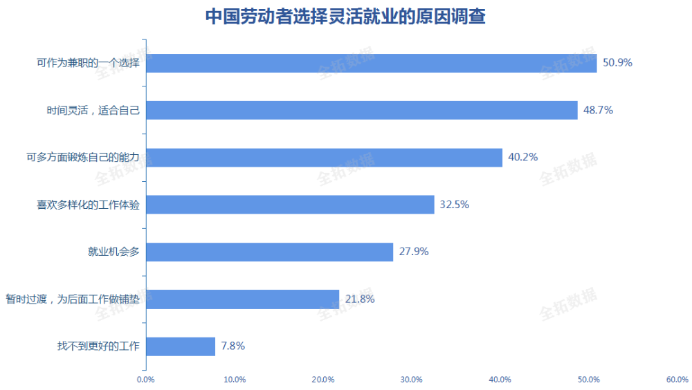对劳动者来说,有五成的中国劳动者选择灵活就业的首要原因是,可作为兼职的选择;其次是,时间灵活适合自己。目前,越来越多的人喜欢灵活就业,不光能让自己感觉时间自由,而且还可以多方面选择行业种类。灵活用工的劳动者中,已婚已育人群占据大多数,灵活就业的工作方式能让他们更好地平衡家庭和工作。