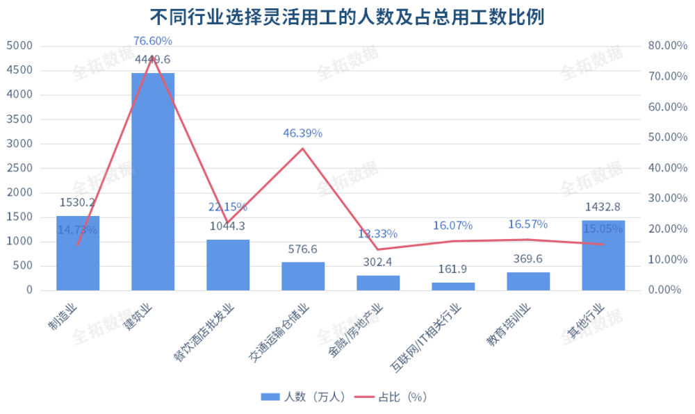 从行业来看,建筑业灵活用工人员占比最高,灵活用工人数达到4449.6万,灵活用工人员比例占总用工数比例的76.6%。其次是制造业,灵活用工人数在1530.2万。交通运输仓储业虽然灵活用工人数只有576.6万,但是灵活用工人员比例占总用工数比例达到46.39%,仅次于建筑业。由于这些行业的劳动者流动频繁,需要大量兼职人员成为企业劳动力的补充,以解决不定期的业务用工需求。